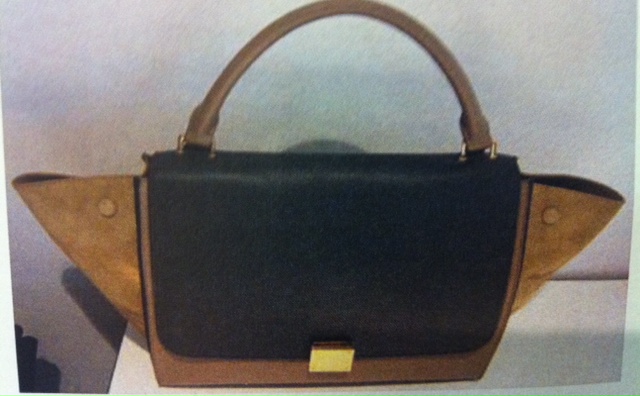 Bi color "olive" Trapeze, olive green suede sides, with black leather flap and olive leather body and handle. 2100.